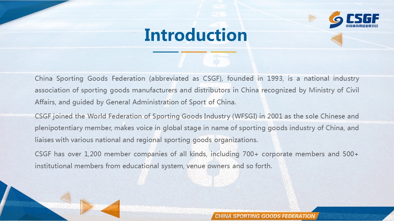China Sporting Goods Federation (abbreviated as CSGF), founded in 1993, is a national industry association of sporting goods manufacturers and distributors in China recognized by Ministry of Civil Affairs, and guided by General Administration of Sport of China.