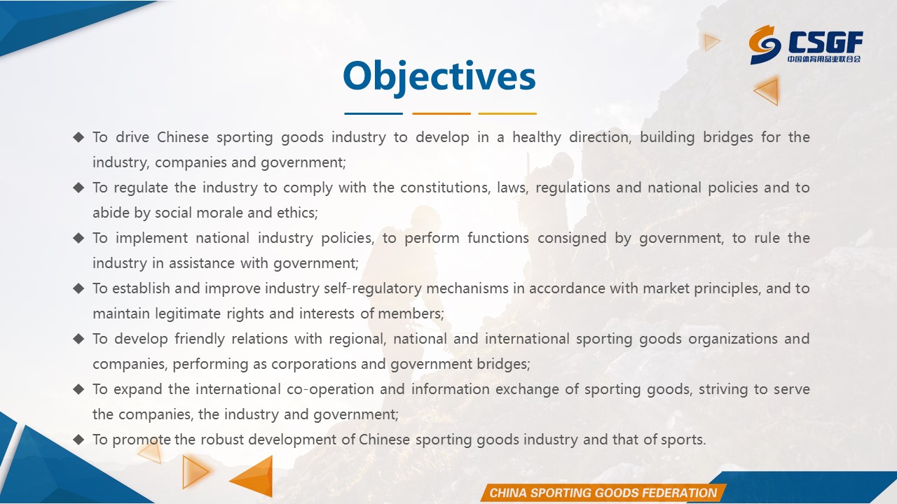 To drive Chinese sporting goods industry to develop in a healthy direction, building bridges for the industry, companies and government;