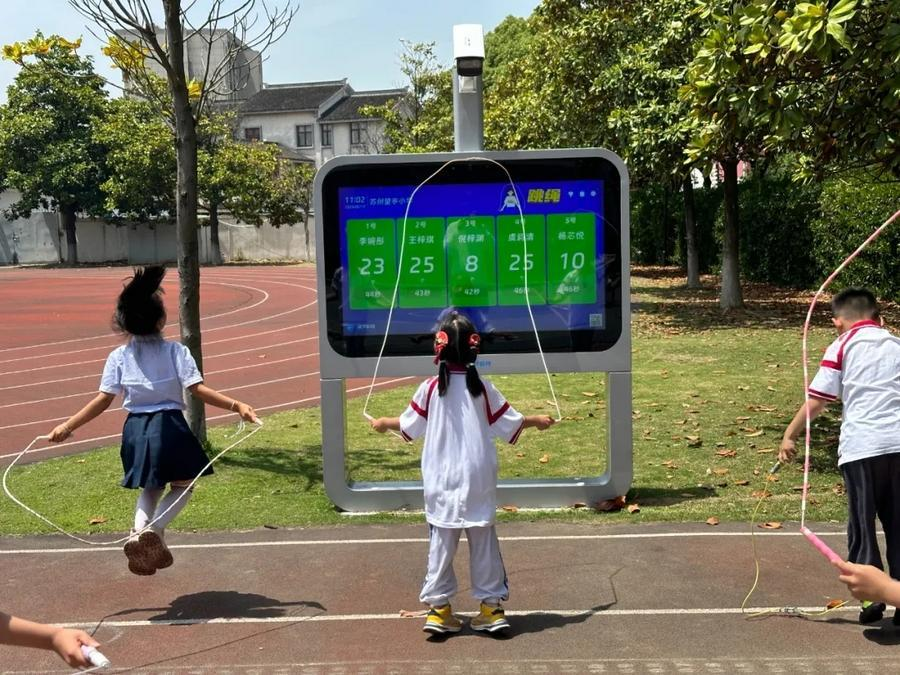 This photo shows school children in Jiangsu practicing rope skipping in front of an AI-powered counting equipment. (Xinhua)